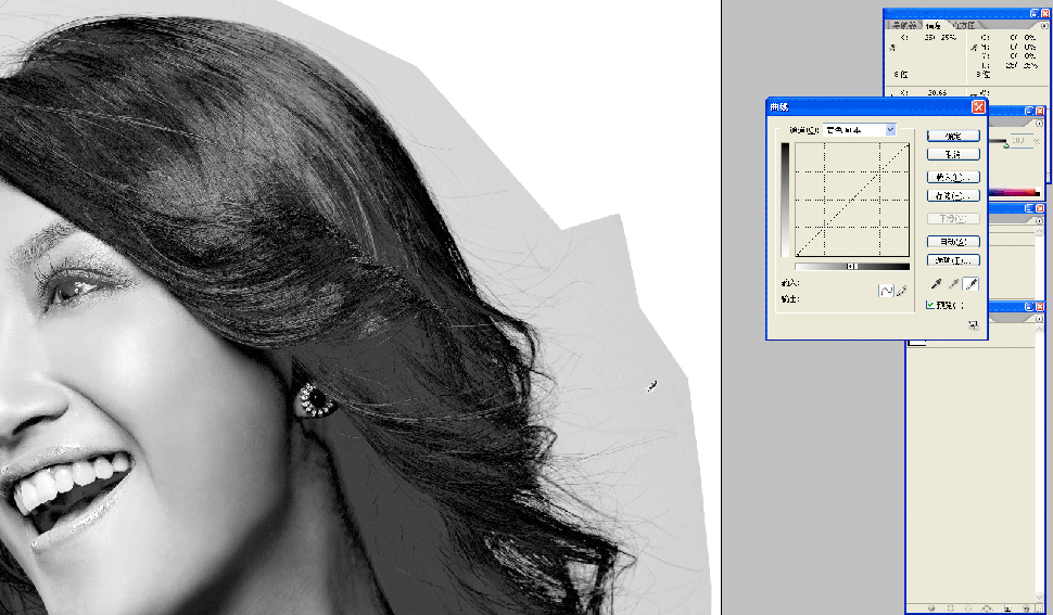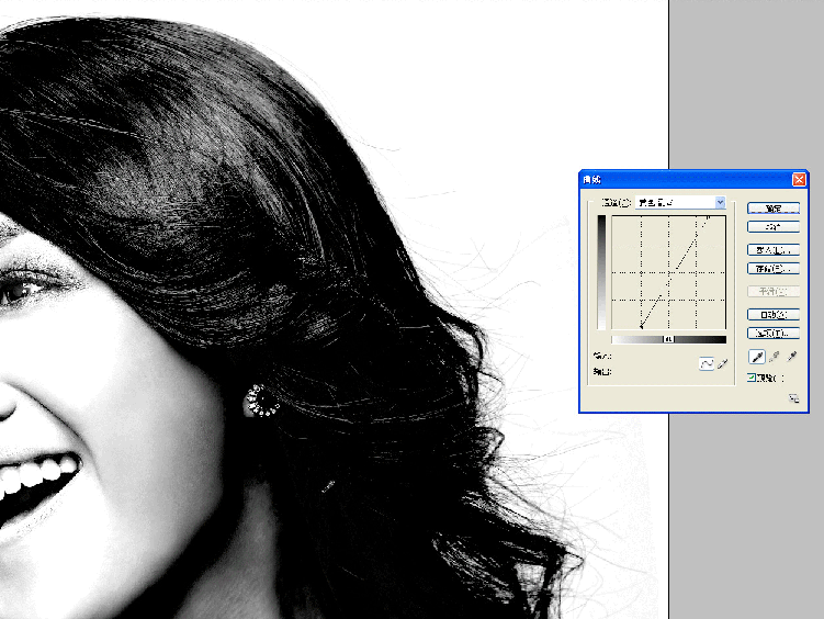 5.執行“圖像”→“調整”→“色階”命令,打開“色階”對話框.(快捷鍵:Ctrl+L)點按"設置白場"按鈕.在頭發邊緣的背影上點一下,讓背影成為白色(大家最好試點幾下背景,注意觀看飄出來的頭發,看看點在哪個位置的發絲層次最好.)再選"設置黑場"按鈕,在頭發暗的地方點一下這樣就OK了.如果背影還有些少灰度,大家可以用曲線調色工具來調整背為白色.