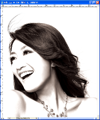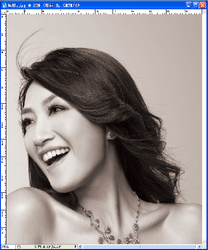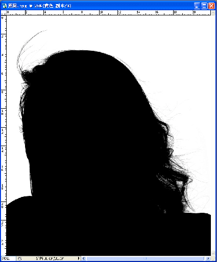 6.選擇畫筆工具,設置為硬筆,前景色設為100%黑色.除頭發的邊緣外,將頭發全涂上黑色.再用加深工具,硬度設為"0"放大加深工具,在頭發邊緣上涂,在涂時要流暢,要讓飄起的發絲自然地黑,不可以看到發邊有鋸齒.(在此教大家一個小巧門,當用畫筆在人物上涂黒時,因為我們是在通道上工作看不清哪個部位是我們要的,這時大家可以按回到彩圖,這樣就可以看得更清楚那些要那些不要了)